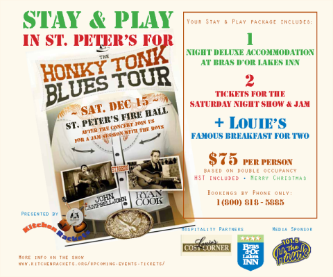 If you're coming in from out of town - or just want to get out of the house for a night - here is a great overnight stay and breakfast - packaged with tickets which are worth $20 each themselves. Like it says above, Stay & Play when you come for the Honky Tonk Blues Tour. Your comfy room at the Bras d'Or Lakes Inn is a short walk from the Firehall, and Sunday morning you'll be treated to Louie's famous breakfast special, just up the street. It's all handy, and this is good value for $75, including tax. If the weather holds, you'll probably find an acre or two of yard sales on main street. And a stroll around the canal is always refreshing this time of year.